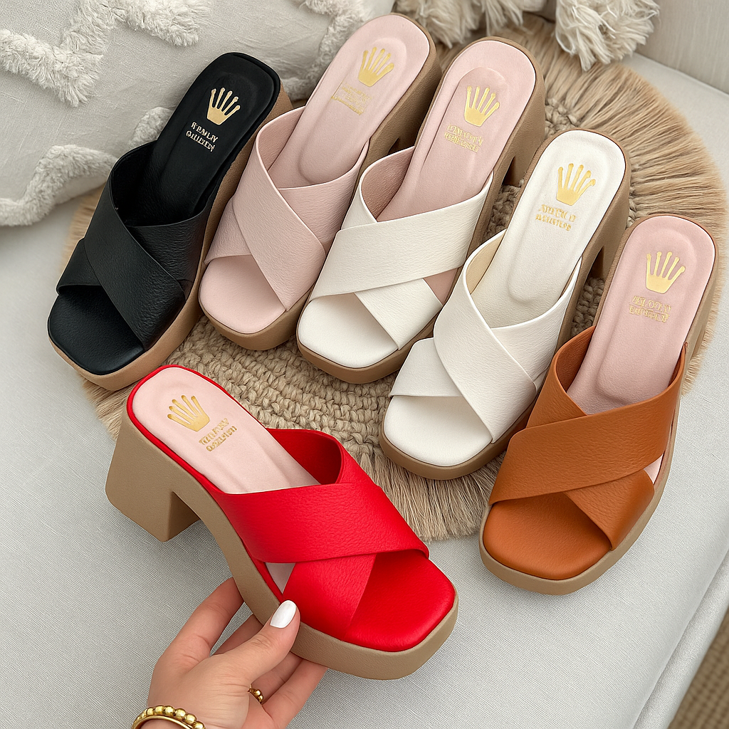 Descubre nuestros tacones de cuero, diseñados para realzar tu estilo con un toque moderno y atrevido. Su plataforma ergonómica y plantilla acolchada brindan confort durante todo el día, mientras que el diseño cruzado aporta un look sofisticado y versátil, ideal para cualquier ocasión.